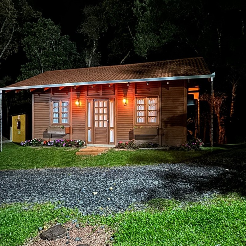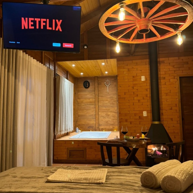 Para o seu conforto, o chalé conta com chuveiro a gás, banheira de hidromassagem, lareira interna, cama king size, frigobar, TV Smart e sacada com vista panorâmica da natureza — tudo pensado para proporcionar uma estadia aconchegante e inesquecível.