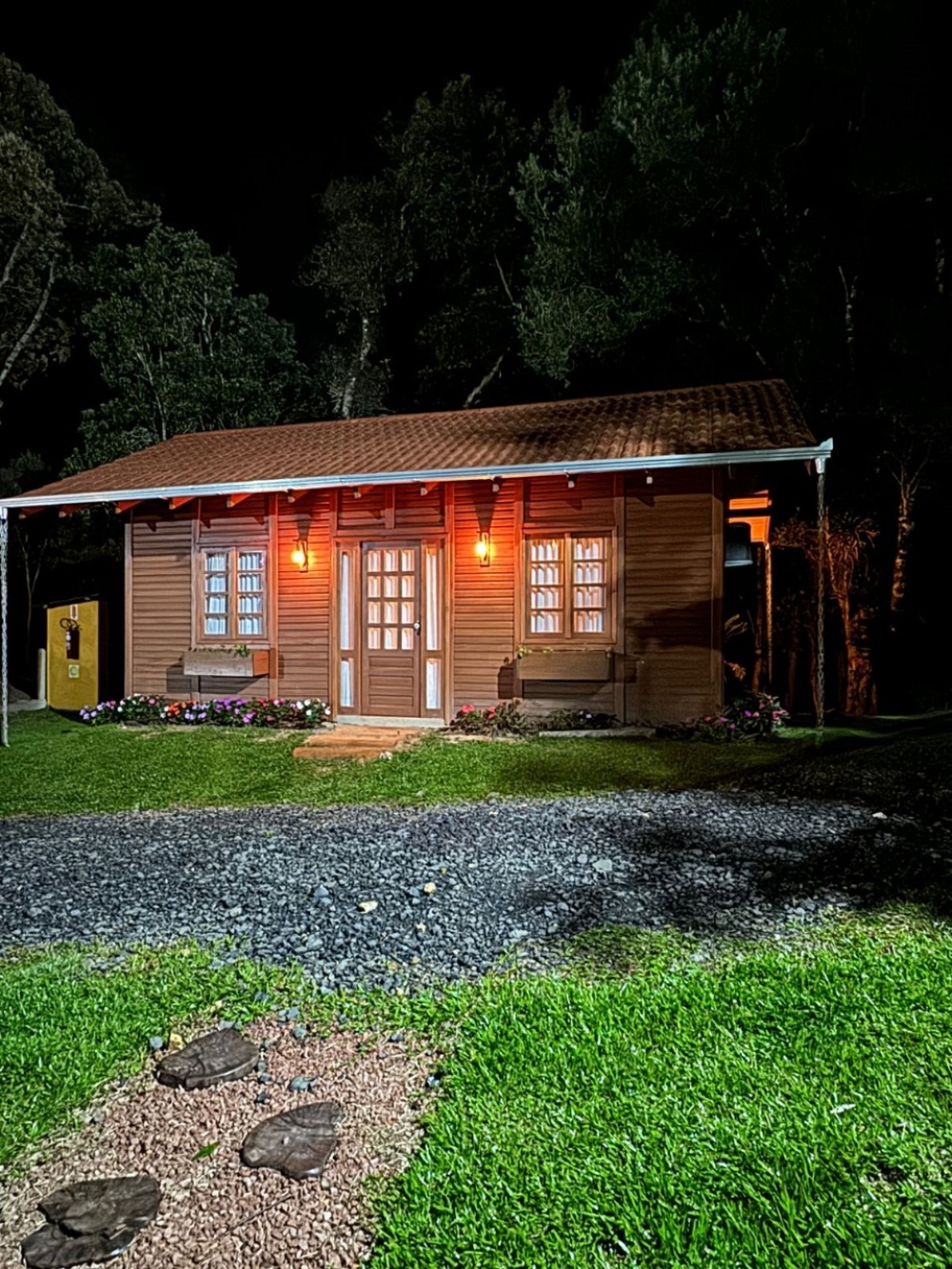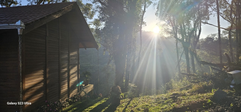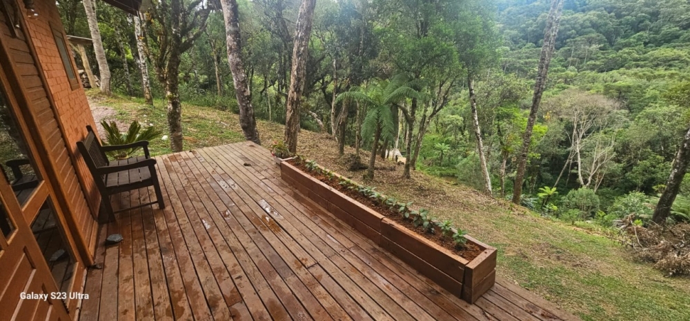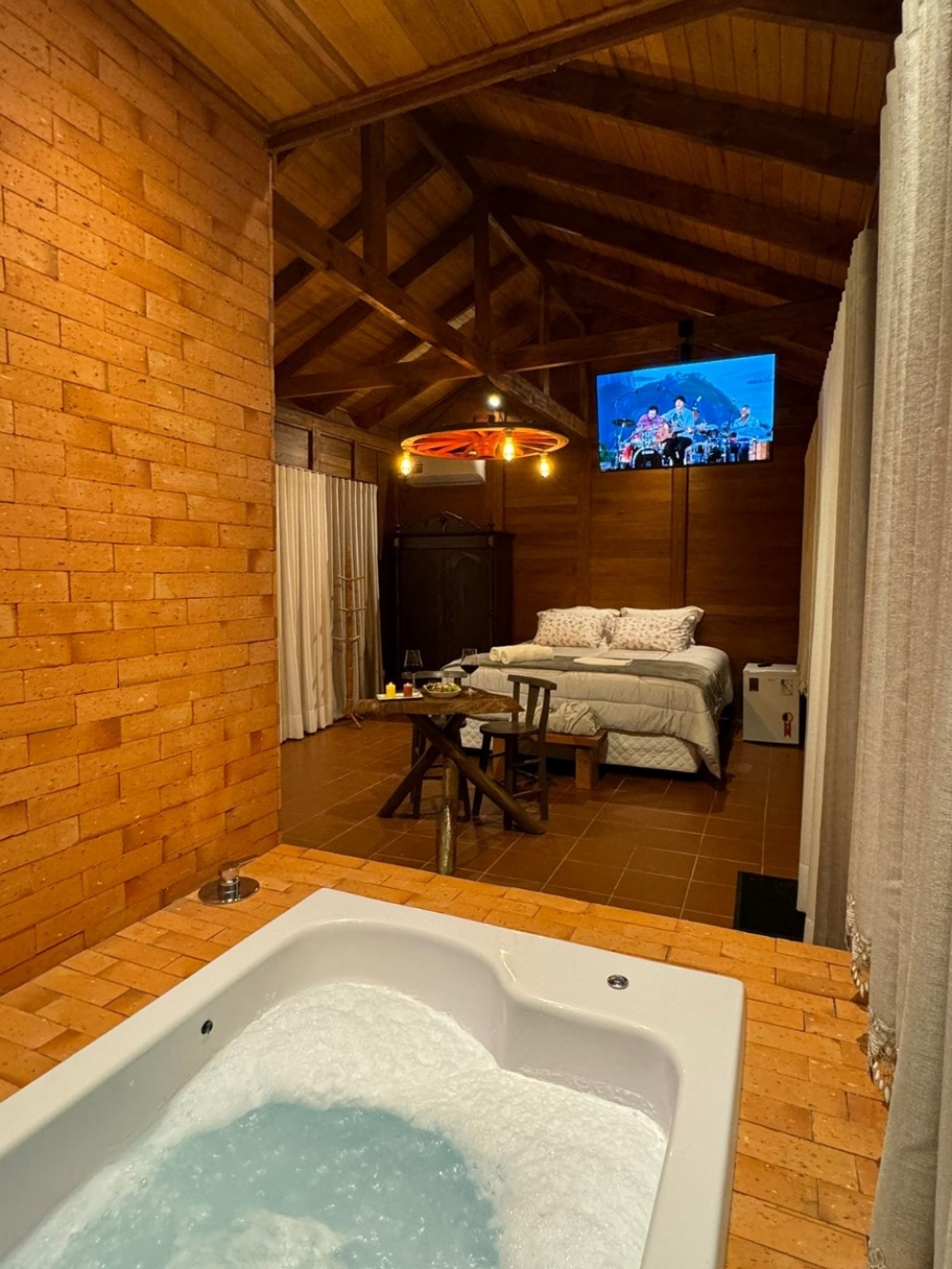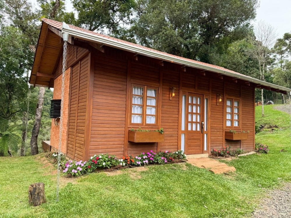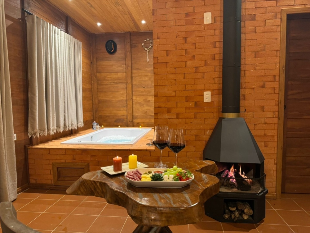 Para o seu conforto, o chalé conta com chuveiro a gás, banheira de hidromassagem, lareira interna, cama king size, frigobar, TV Smart e sacada com vista panorâmica da natureza — tudo pensado para proporcionar uma estadia aconchegante e inesquecível.